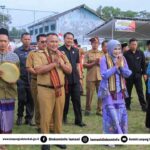 Bupati lamsel yang hadir bersama sejumlah PPD, langsung disambut Penampilan pencak silat saat tiba di lokasi acara yang dipusatkan di Lapangan SMK Negeri 1 Bakauheni, Selasa (31/01/2023).