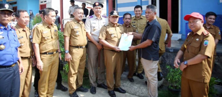 Penyerahan sertifikat tahap pertama itu diberikan secara simbolis oleh Bupati Lampung Selatan H. Nanang Ermanto kepada penerima bantuan di lokasi Huntap, yang dipusatkan di Blok A Desa Way Muli Timur, Kecamatan Rajabasa, Senin (5/6/2023).