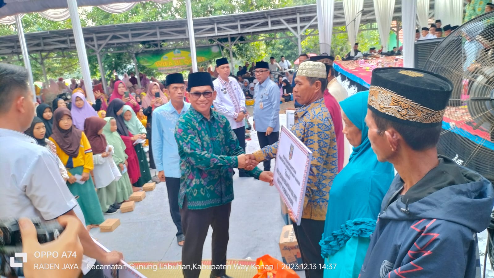 BUMILAMPUNG.com, Gunung Labuhan,- Bupati Waykanan Raden Adipati Surya, S.H,M.M Bersama Ketua Tim Penggerak PKK Kabupaten Waykanan Ny. Hj. Dessy Afriyanti Adipati Menghadiri Pengukuhan Majelis Taklim Permata Bunda dan Pengajian Akbar bertempat di halaman kantor Camat Gunung Labuhan Rabu 13/12/2023.