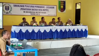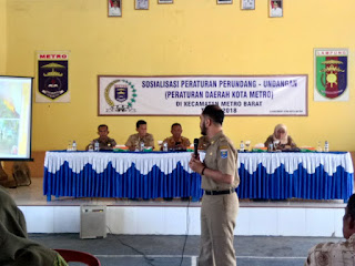 Ia menyebutkan, terdapat tiga Perda Kota Metro yang menjadi materi sosialisasi, yakni Perda nomor 9 tahun 2017 tentang Ketertiban Umum, Kebersihan dan Keindahan, dengan narasumber Kepala Bidang Penegakkan Perda Sat Pol PP Yoseph Nanotek, dan Sekretaris Dinas Lingkungan Hidup Yerry Noer Kartiko.