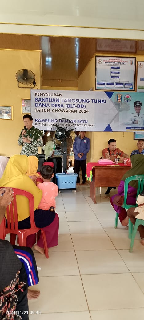 Kegiatan pembagian BLT DD tersebut di hadiri langsung oleh Camat Gunung Labuhan Syaidan S.E, dan dalam sambutannya menyampaikan kepada seluruh masyarakat penerima BLT DD kampung Banjar Ratu, BLT DD yang di bagikan tersebut adalah untuk Bulan Oktober, November, dan Desember dan Jumlahnya Rp. 900 000, dan mudah-mudahan selalu diberikan kesehatan dan selalu di lancarkan Rezeki nya Amiin. Semoga bantuan dari pemerintah kampung Banjar Ratu ini bisa bermanfaat bagi bapak/ibu semuanya dan membantu memulihkan perekonomian bapak/ibu. Penerima KPM.
