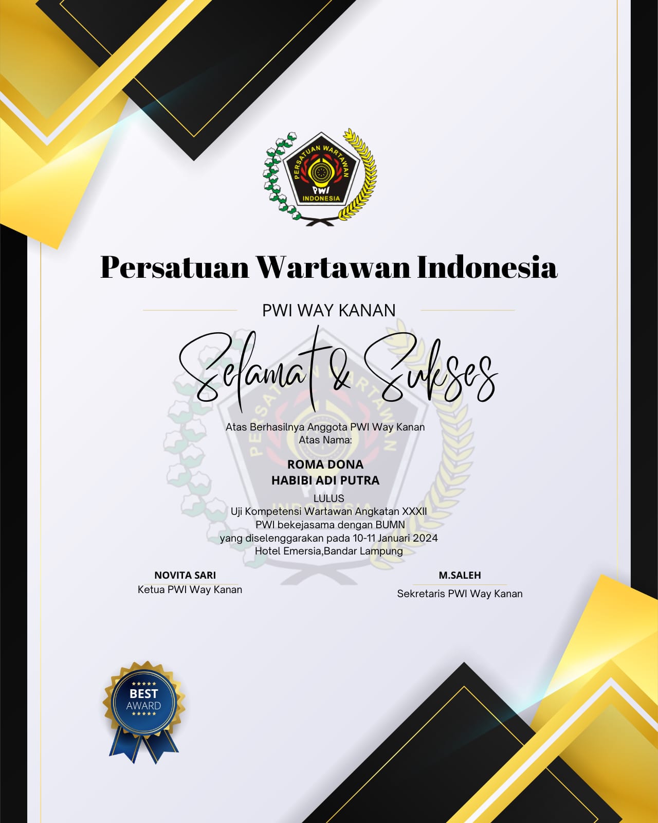 “Kami PWI Kabupaten Waykanan mengapresiasi kepada wartawan Bumilampung.com Habibi Adi Putra dan Predikat New Roma Dona yang mengikuti UKW dan telah lulus dengan nilai memuaskan,” ujar Novita Sari Ketua PWI Waykanan.