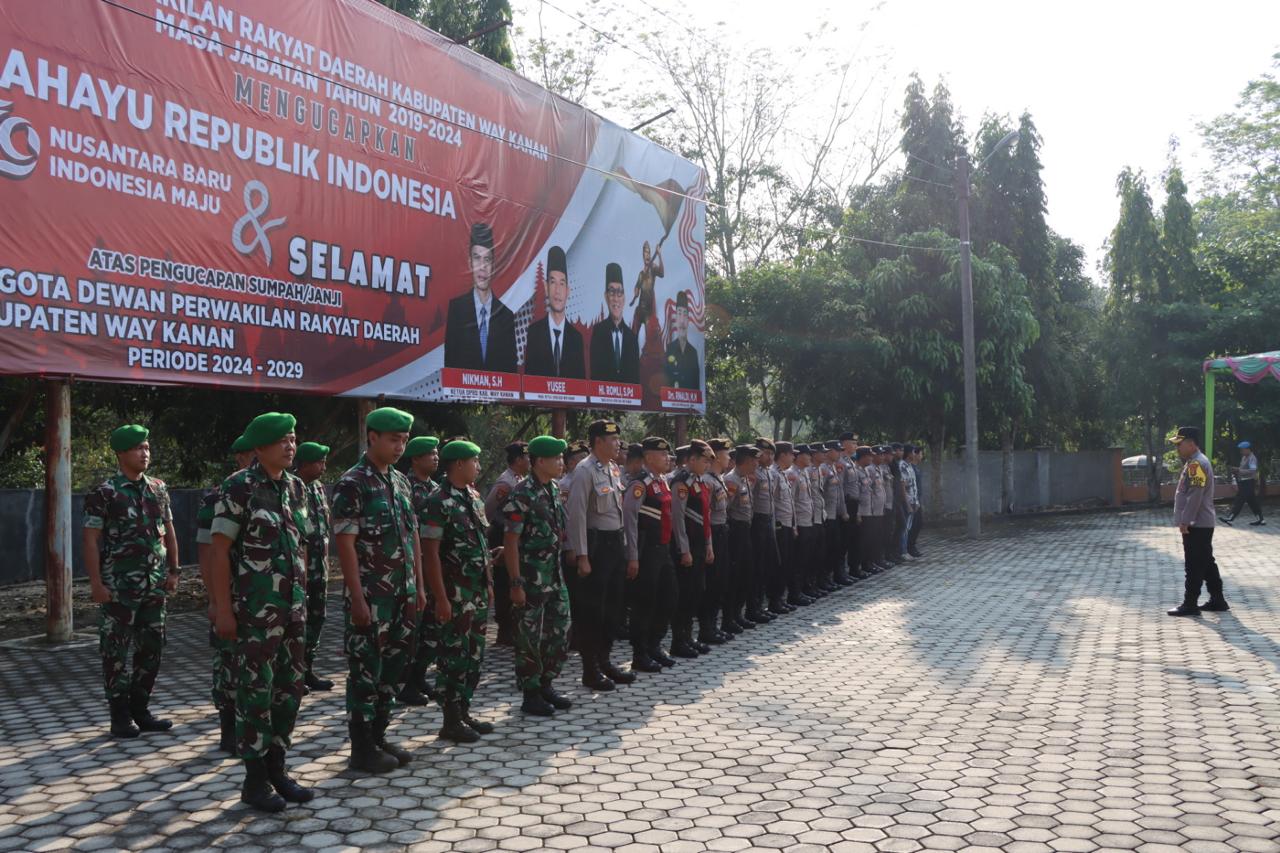 BUMILAMPUNG.COM- Ratusan aparat gabungan disiagakan untuk mengamankan pelantikan dan pengambilan sumpah janji anggota Dewan Perwakilan Rakyat Daerah (DPRD) Kabupaten Way Kanan periode 2024-2029 bertempat di Gedung DPRD Kabupaten Way Kanan. Senin (19/08/2024).