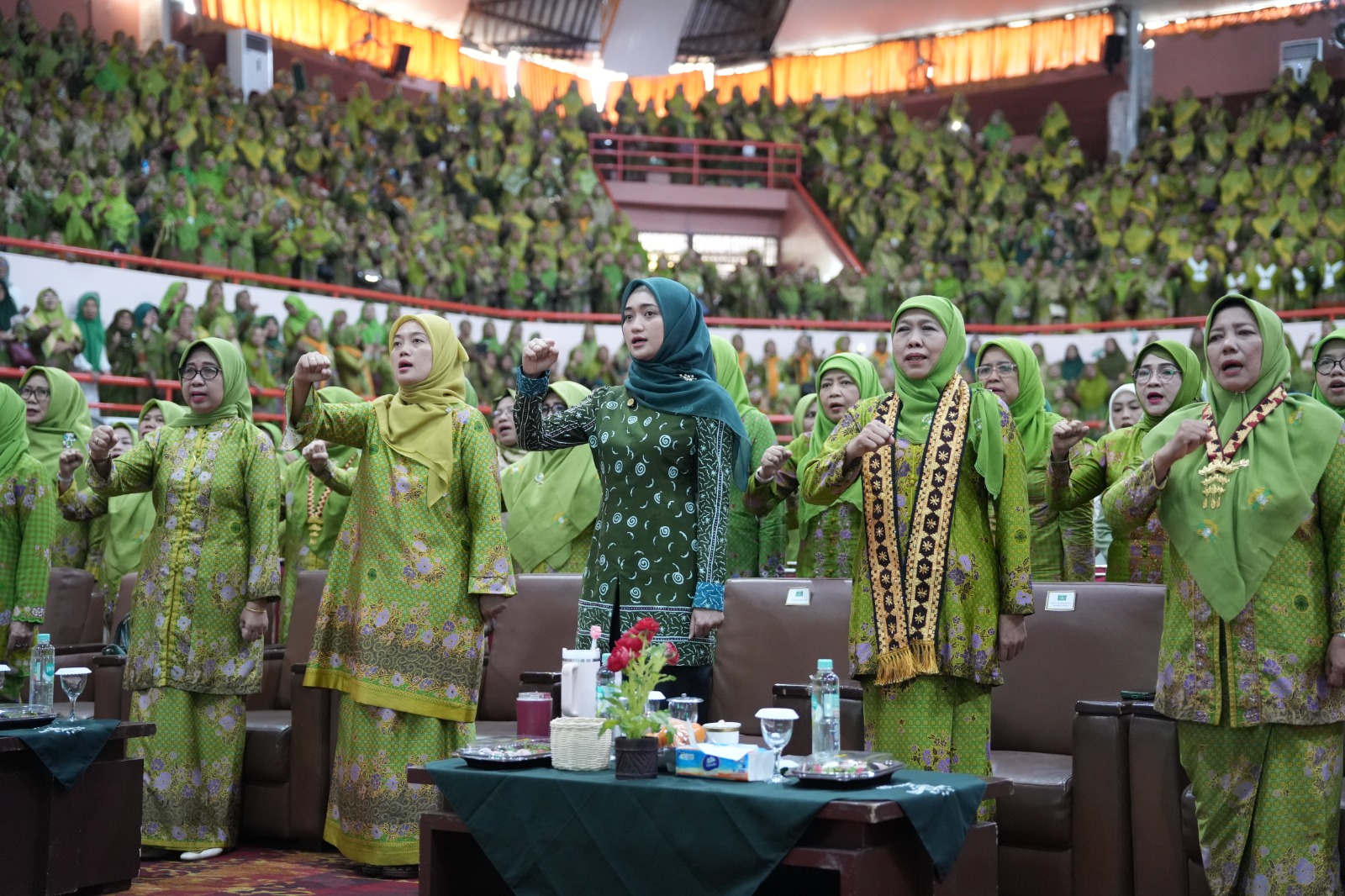 BANDARLAMPUNG — Wakil Gubernur Lampung Jihan Nurlela bersama Ketua Umum Dewan Pembina Pimpinan Pusat Muslimat Nahdlatul Ulama Khofifah Indar Parawansa, yang juga Gubernur Jawa Timur, menghadiri Tasyakur dan Hari Lahir (Harlah) Muslimat Nahdlatul Ulama ke-80 yang dirangkaikan dengan inaugurasi paralegal Muslimat NU dan halal bihalal di Gedung Serba Guna Universitas Lampung, Minggu (26/4/2026).